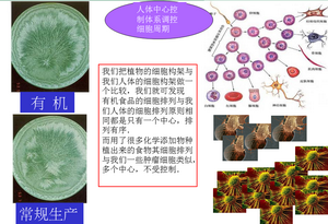 我们把植物的细胞构架与我们人体的细胞构架做一个比较,我们就可发现:有机食品的细胞排列与我们人体的细胞排列原则相同都是只有一个中心,排列有序。而用了很多化学添加物种植出来的食物其细胞排列与我们一些肿瘤细胞类似,多个中心,不受控制。